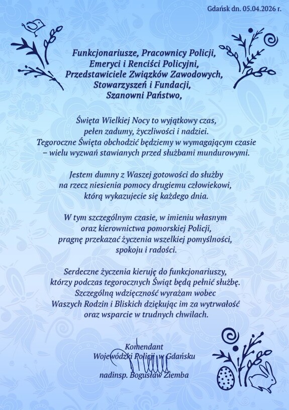 Życzenia Komendanta Wojewódzkiego Policji w Gdańsku z okazji Świąt Wielkiej Nocy Data publikacji: 03.04.2026 Pomorska Policja