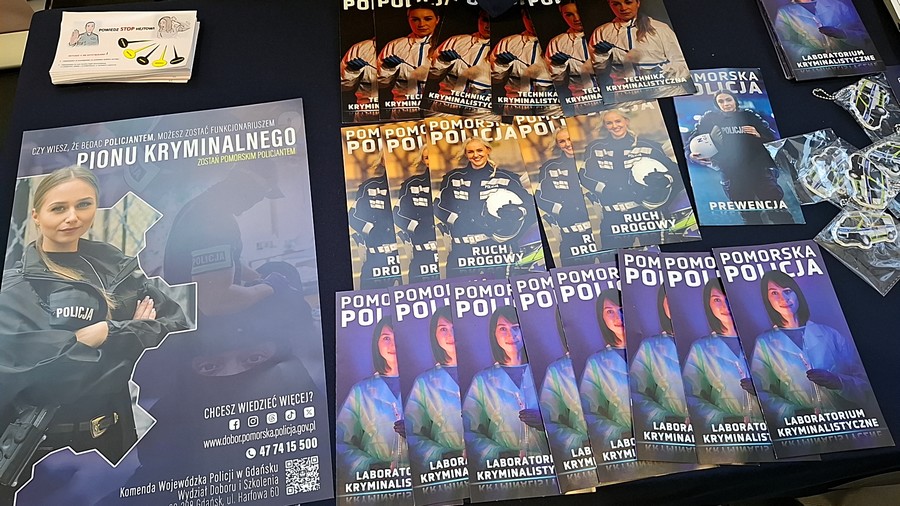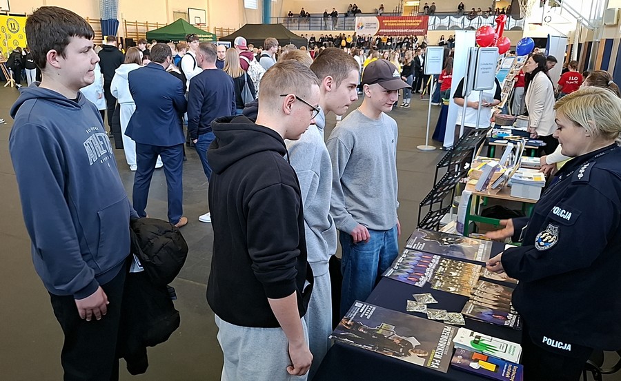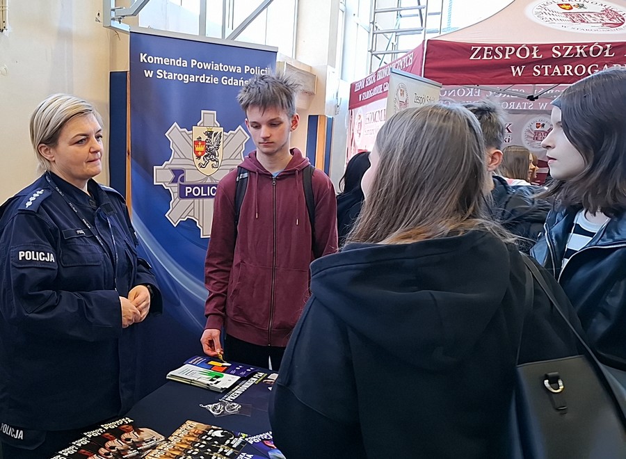 W Powiatowych Targach Edukacyjnych, które odbyły się 19 marca 2026 roku w hali sportowej Zespołu Szkół Ekonomicznych w Starogardzie Gdańskim. W wydarzeniu o charakterze promocyjno-informacyjnym uczestniczyło blisko 1200 uczniów z 34 szkół. Spotkanie było doskonałą okazją do przedstawienia młodzieży specyfiki zawodu policjanta. Asp. szt. Karolina Przybyłowicz z zespołu ds. profilaktyki społecznej starogardzkiej komendy opowiadała, jakie możliwości daje służba w Policji oraz jakie wymagania trzeba spełnić, aby rozpocząć karierę w policyjnym mundurze. Uczniowie chętnie zadawali pytania. Najczęściej interesowały ich kwestie związane z wynagrodzeniem, wyposażeniem Policji, a także pojazdami wykorzystywanymi w służbie – radiowozami i motocyklami. Duże zainteresowanie wzbudził również temat codziennych obowiązków policjantów.